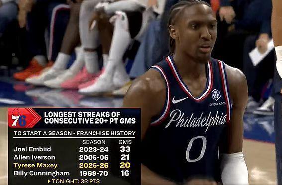 76人双杀奇才:马克西35+6单节20分 连续20场20+队史