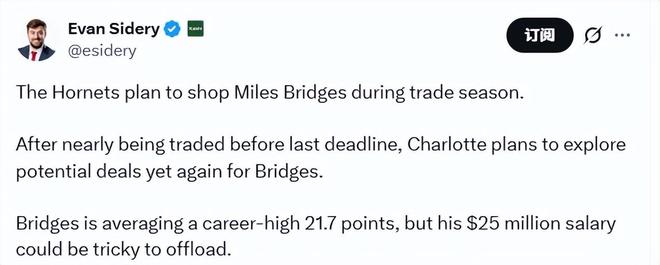 尽管布里奇斯曾有过场外丑闻,但他仍是一名能力极强的侧翼球员。本赛季至今的表现也证明了这一点。现年27岁的布里奇斯出战21场,场均21.7分6.1篮板3.5助攻。 虽然他的外线投射(三分命中率33.3%)难言可靠,但布里奇斯具备不俗的得分爆发力,同时也是合格的防守者。再加上他的运动能力能让他成为空接威胁,他完全可以很好地适配东契奇、里夫斯和詹姆斯为核心的体系。 不过美媒也表示,现阶段与黄蜂队达成交易或许存在阻碍。此前在交易截止日前,湖人队曾撤回关于马克-威廉姆斯的交易,因此黄蜂队大概率不会愿意再与紫金军团进行交易合作。
