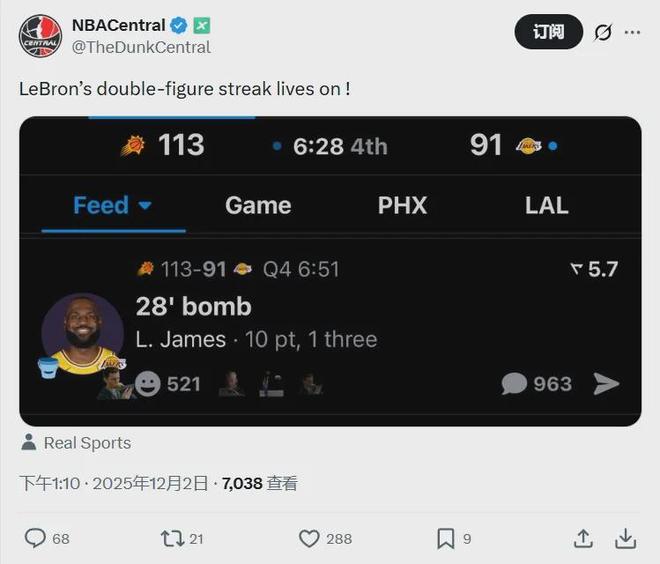 最终全场打完,湖人108-125不敌太阳。 此役詹姆斯31分钟里,出手10次仅得到10分也只送出3次助攻没有篮板进账。 好在单场10分,让这位超巨延续了自己得分上双纪录,已连续1297次得分上双,乃NBA史上最长纪录,上次单场得分未上双还得追溯到2007年。