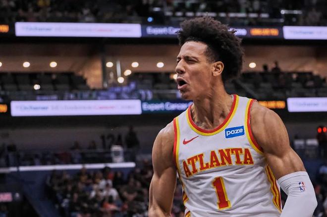 2.杰伦・约翰逊:3000万薪资,扛起球队复兴大旗 自特雷・杨再次受伤后,杰伦・约翰逊终于让全联盟看到了亚特兰大真正的领军人物是谁。这位24岁的锋线拿着5年1.5亿美元合同的第一年3000万美元,却交出了场均23.3分10篮板7.3助攻的全能数据。值得一提的是,本赛季场均至少22分、9个篮板、7次助攻的球员有三个,而杰伦约翰逊就是除了约基奇和申京外的第三人。更令人惊叹的是,他在得分、篮板、助攻和投篮命中率四项核心数据中均位列老鹰队内第一,彻底扛起了球队的攻防大旗。 约翰逊的价值不仅体现在数据上:身高2.03米、体重100公斤的他,既能在三分线外交出38%的命中率,又能强势冲击篮筐制造杀伤,防守端更是传球路线上的“抢断机器”,多次通过抢断转化为快攻得分。更关键的是,他的合同为固定薪资,随着未来联盟工资帽逐年上涨,到合同最后一年,仍是3000万美元的薪资,届时只占工资帽的15%,对一支处于重建期的球队而言,这样的“超值核心合同”无疑是加速复兴的关键。