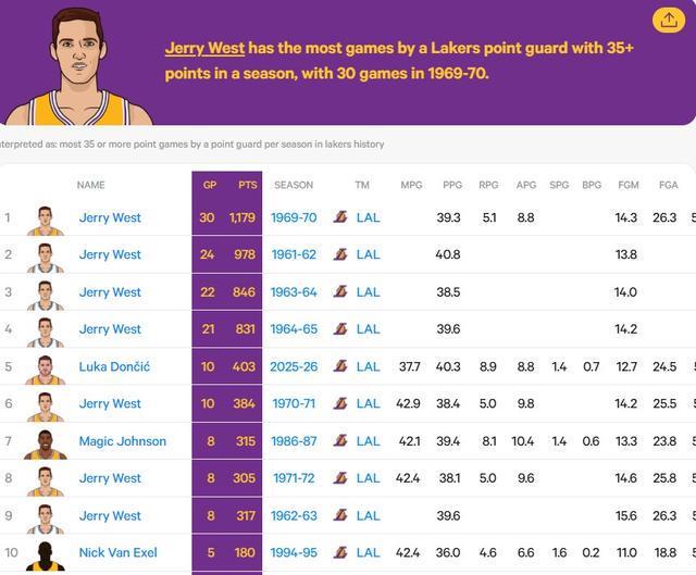 东契奇砍赛季第10次35+得分,1971年韦斯特后湖人
