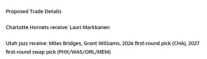 4.黄蜂组建三巨头:马尔卡宁加盟 交易细节 ✅黄蜂得到:劳里・马尔卡宁 ✅爵士得到:布里奇斯、格兰特・威廉姆斯、2026年黄蜂首轮签、2027年首轮交换权 黄蜂6胜15负的战绩未能达到预期,拉梅洛・鲍尔场均18.9分8.9助攻但投篮命中率仅37.8%,失误率偏高。28岁的马尔卡宁是完美补强——场均28.0分6.4篮板,三分命中率36.0%,无球得分能力突出,与鲍尔、布兰登・米勒组成的三巨头有望将黄蜂从乐透区带入季后赛。 爵士铁定会在后期加速重建,以保留自己的首轮签:布里奇斯场均21.7分的冲击力、威廉姆斯的防守实力,加上高顺位选秀权,为球队囤积重建资产。这笔交易薪资匹配合理,爵士摆脱了马尔卡宁4630万美元的高薪合同,黄蜂则赌上现在冲击季后赛。