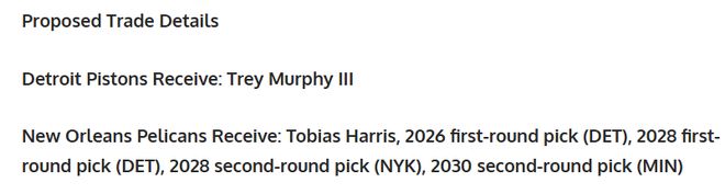 10.活塞全力冲冠:引进特雷・墨菲三世 交易细节 ✅活塞得到:特雷・墨菲三世(前锋) ✅鹈鹕得到:托比亚斯・哈里斯、2026年活塞首轮签、2028年活塞首轮签、2028年尼克斯次轮签、2030年森林狼次轮签 活塞17胜4负位列东部第一,凭借13连胜惊艳联盟,但仍需边路得分手。23岁的墨菲场均19.7分6.2篮板3.2助攻(三分命中率37.1%),其无球跑动和防守多样性能完美适配坎宁安的体系,有望帮助活塞锁定东部头号种子。鹈鹕(3胜15负)深陷西部垫底,锡安无限期伤停让球队被迫重建。哈里斯的到期合同(2660万美元)和多个高顺位选秀权,为鹈鹕重建积累充足资本。这笔交易让活塞的冲冠阵容更趋完美,鹈鹕则获得重建核心资产。