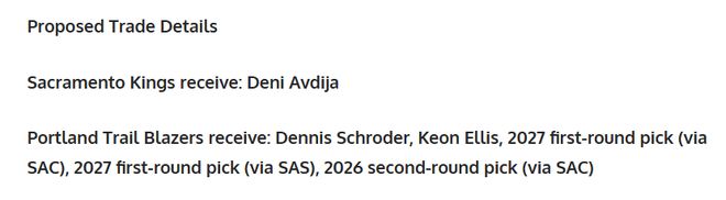 2.国王引进阿夫迪亚:拯救低迷赛季 交易细节 ✅国王得到:德尼・阿夫迪亚 ✅开拓者得到:施罗德、基恩・埃利斯、2027年国王首轮签、2027年马刺首轮签、2026年国王次轮签 国王队5胜16负的战绩持续下滑,萨博尼斯因膝伤缺阵数周,德罗赞和拉文陷入单打困境,球队缺乏真正的进攻组织者。24岁的阿夫迪亚成为解决方案——这位身高2.03米的控球前锋在开拓者场均贡献25.8分7.1篮板5.8助攻,三分命中率37.8%,能防守1-4号位,完美契合国王的重建时间线。开拓者则借此套现:施罗德作为到期合同老将能补充后场经验,潜力新星埃利斯的防守能力备受关注,加上多个高顺位选秀权,积累重建资本。为夏普、斯库特・亨德森、杨瀚森等年轻球员的培养留出时间。