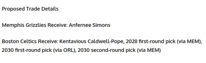 9.灰熊引进西蒙斯:解锁莫兰特 交易细节 ✅灰熊得到:安弗尼・西蒙斯 ✅凯尔特人得到:肯塔维厄斯・考德威尔-波普(KCP)、2028年灰熊首轮签、2030年魔术首轮签、2030年灰熊次轮签 灰熊9胜12负挣扎于西部中游,贾・莫兰特场均17.9分7.6助攻但投篮命中率仅35.9%,缺乏稳定第二得分点。26岁的西蒙斯场均13.7分2.6助攻(三分命中率40.7%),其急停三分和得分爆发力能为莫兰特拉开突破空间,缓解进攻压力。凯尔特人则补强防守:KCP的顶级外线防守和定点投篮完美适配塔图姆和杰伦・布朗的体系。这笔交易让灰熊在不改变核心的前提下提升进攻,凯尔特人则增强了争冠阵容深度。