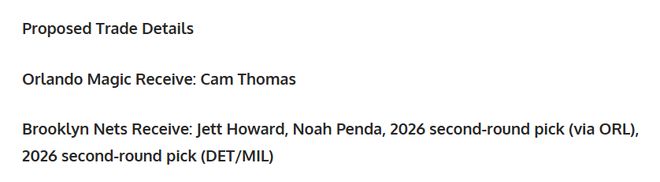 6.魔术低风险引进得分手 交易细节 ✅魔术得到:卡姆・托马斯 ✅篮网得到:杰特・霍华德、诺亚・彭达、2026年魔术次轮签、2026年活塞/雄鹿次轮签 篮网4胜16负沦为联盟最差球队之一,卡姆・托马斯前8场场均21.4分(三分命中率38.9%),但腿筋拉伤后将于12月4日获得交易资格,明年夏天将成为自由球员的他已成重建牺牲品。魔术(13胜8负)防守排联盟第九,但进攻仅第18位,托马斯的即插即用型得分能力(四次单场20+)能完美担任第六人,为班切罗和瓦格纳拉开空间。篮网则收获潜力股:22岁的杰特・霍华德和20岁的诺亚・彭达具备发展潜力,加上选秀权,加速重建进程。这笔低风险交易让魔术在不削弱核心的前提下补强进攻。
