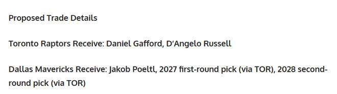 8.猛龙补强内线竞争力 交易细节 ✅猛龙得到:丹尼尔・加福德(中锋)、丹杰洛・拉塞尔(后卫) ✅独行侠得到:雅各布・波尔特尔、2027年猛龙首轮签、2028年猛龙次轮签 猛龙14胜7负位列东部第四,防守效率排联盟第五,但内线护筐存在短板。27岁的加福德场均9.4分6.5篮板1.5盖帽(投篮命中率61.7%),能提升内线垂直威胁;拉塞尔替补场均11.7分4.7助攻,为关键时刻提供得分火力。独行侠则收获即战力波尔特尔(场均10.5分8.3篮板)和未来选秀权。猛龙通过这笔交易,在保留核心阵容的前提下提升了运动能力和替补深度,同时优化薪资结构。