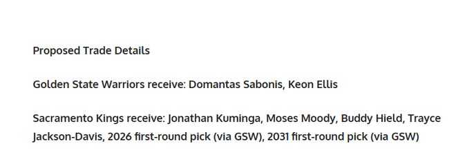 7.勇士国王超级交易:萨博尼斯加盟 交易细节 ✅勇士得到:多曼塔斯・萨博尼斯(中锋)、基恩・埃利斯(后卫) ✅国王得到:库明加、摩西・穆迪、巴迪・希尔德、特雷斯・杰克逊-戴维斯、2026年勇士首轮签、2031年勇士首轮签 勇士11胜10负徘徊季后赛边缘,急需内线组织者。29岁的萨博尼斯场均17.2分12.3篮板3.7助攻(投篮命中率51.0%),是联盟顶级策应型中锋,能完美适配库里和巴特勒的体系。加上防守型后卫埃利斯,勇士攻防两端将全面升级。国王彻底重建:库明加的爆发力、穆迪的投篮、杰克逊-戴维斯的冲筐能力,加上两个高顺位选秀权,为未来奠定基础。这笔交易让勇士跻身西部前四行列,国王则获得重建核心。