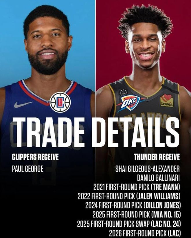 更令人意想不到的是,这位年轻人将在一年后成为NBA历史上最具影响力的交易筹码之一。韦斯特这笔向上交易的操作,成为快船过去十年中为数不多的选秀好眼光时刻。 2019年2月,快船完成了一笔被戏称为“同城打劫”的交易:他们将迈克·穆斯卡拉送到湖人,换来了年轻中锋伊维察·祖巴茨。当时的祖巴茨在湖人仅是轮换末端球员,但来到快船后迅速成长为可靠的首发中锋。如今回头看,这笔交易为快船带来了未来近十年的内线支柱,其性价比之高在当今联盟实属罕见。 这两年,快船的运营模式都在正确的道路上,然而,2019年夏天的操作才是真正改变快船命运的关键节点。刚带领猛龙夺冠的伦纳德成为自由市场的最大牌球星。为得到他,快船答应了其团队提出的必须配备一位全明星级别队友的条件。随即,快船与雷霆达成协议,以9换1的惊人代价换来了保罗·乔治。 具体交易内容是:送出亚历山大、加里纳利、以及5个首轮签和2个首轮互换权,换来保罗乔治。当时快船管理层的逻辑看似合理:乔治是当打之年的全明星,能与伦纳德组成联盟最强的锋线组合;而亚历山大虽有潜力,但何时能成长为全明星级别仍是未知数。