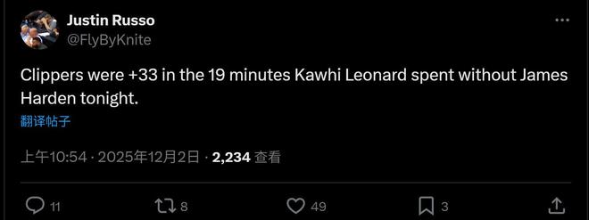 队记赛后拱火 快船随队记者Justin Russo赛后又发文拱火,指出在哈登没登场的19分钟里面,小卡单独带队赢了33分,明牌球队输球责任在哈登。