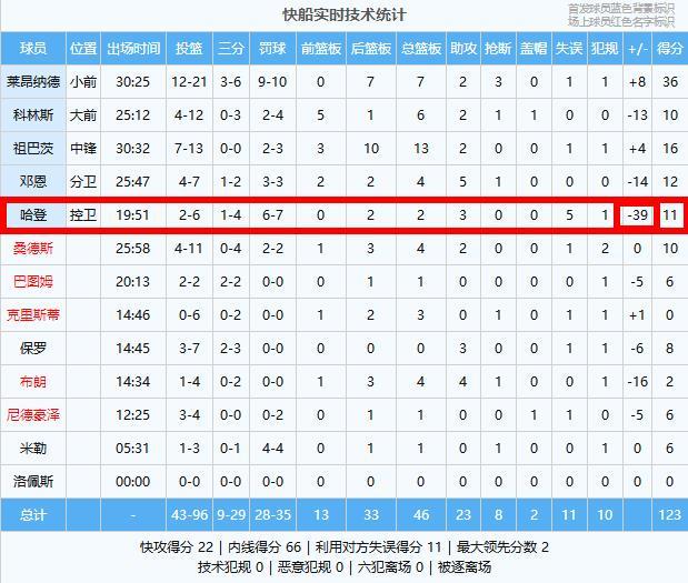 看数据:头号罪人是他! 头号罪人(哈登):全场6中2得11分2篮板3助攻进账,却出现了5次失误,正负值-39断档倒数第一,进攻端状态全员处理球过于随意失误太多,第二节后半段上来球队被打了一波10-29,下半场仅仅打了一分钟就被弃用,作为运动员在场上连最基本的拼搏态度都没有,刷新了职业下限!