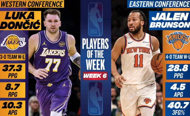 第一则:周最佳球员诞生,布伦森东契奇当选 NBA官方公布了第6周的东西部周最佳球员,东部由尼克斯后卫布伦森当选,西部由湖人后卫东契奇当选。布伦森上周场均贡献28.8分+4.5助攻,带领尼克斯取得4胜0负的战绩。据统计,这是布伦森生涯第8次当选周最佳球员。东契奇上周场均爆砍37.3分+8.7篮板+10.3助攻,带领湖人取得3胜0负的战绩。据统计,这是东契奇生涯第15次获此殊荣。值得一提的是,贝恩、布朗、希罗、杰伦约翰逊、西亚卡姆、埃迪、华子、亚历山大、穆雷和里夫斯等球星获得了周最佳提名。