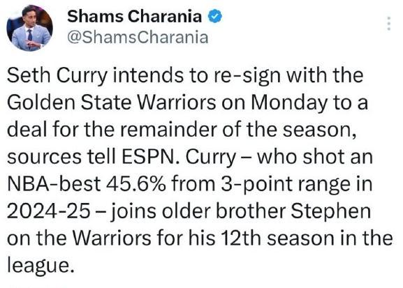 勇士重新签约库里,这一次签的是赛斯-库里,合