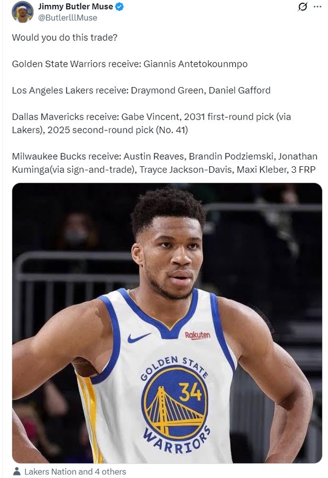 值得一提的是勇士媒体也希望能得到扬尼斯,他们模拟了湖人、勇士、独行侠、雄鹿四方大交易。 |
