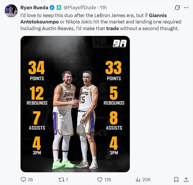 你们会发生从上个月开始,各队的记者、媒体都在观望扬尼斯的动向,湖人记者Ryan Rueda就在畅想扬尼斯联手东契奇、里夫斯的画面,他认为扬尼斯是詹姆斯最好的替代者。