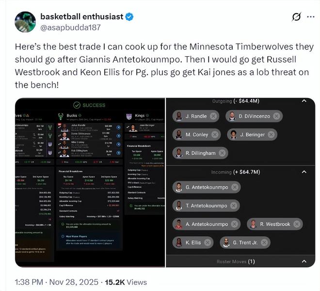 森林狼的媒体也希望能交易得到扬尼斯,他模拟了 雄鹿、森林狼、国王三方交易。