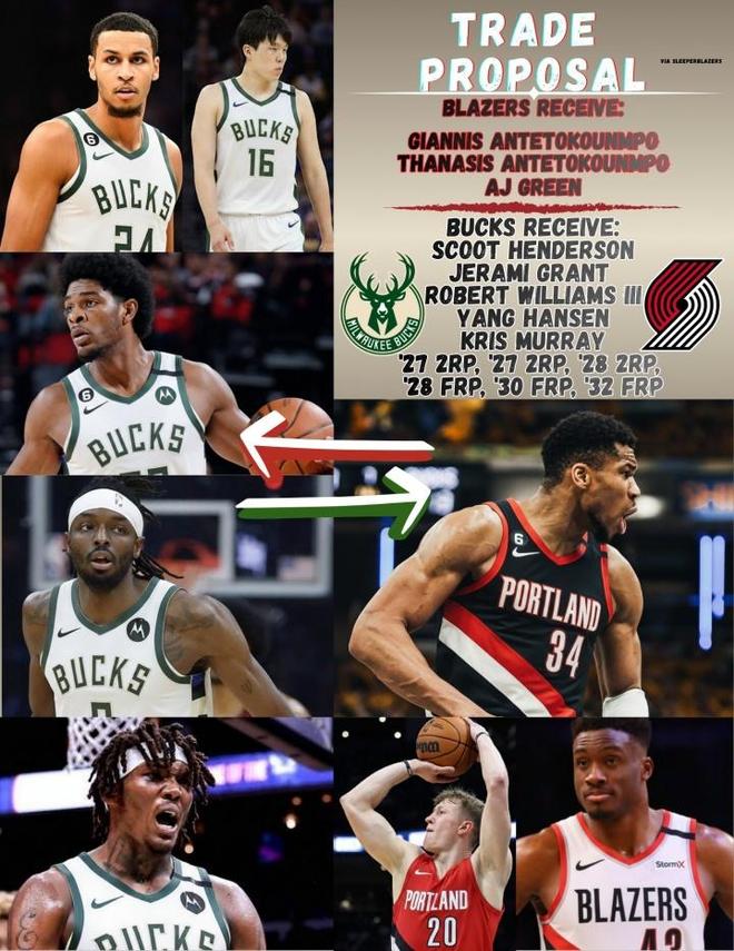 开拓者队作为一支拥有深厚历史底蕴的球队,其阵容中人才济济。在球队的轮转体系里,各个位置上都有经验丰富或者天赋出众的球员占据着主要的上场时间。杨瀚森尽管拥有出色的篮球天赋,但在这样的环境下,想要脱颖而出获得更多展示自己的机会,无疑是困难重重。鉴于此情况,有消息传出杨瀚森即将前往发展联盟打球。发展联盟对于年轻球员来说,是一个锻炼和成长的平台,在这里他或许能得到更多的上场时间和表现机会,从而进一步提升自己的竞技水平。 早在杨瀚森在开拓者队遭遇上场难题时,就已经有人提出建议,认为开拓者索性把杨瀚森交易出去。毕竟对于球队而言,若球员无法为球队做出实质性贡献,那么通过交易或许能换来更适合球队战术体系的球员。 近日,开拓者媒体SleeperTrailBlazers提出了一则引人注目的交易建议。在这一交易方案中,开拓者队将得到扬尼斯·阿德托昆博(字母哥)、萨纳西斯·阿德托昆博(字母哥哥)以及A.J.格林。而雄鹿队则会获得斯库特·亨德森、杰拉米·格兰特、罗伯特·威廉姆斯三世、杨瀚森、克里斯·穆雷等球员,此外还包括2028年首轮签、2030年首轮签、2032年首轮签、2027年次轮签x2、2028年次轮签。