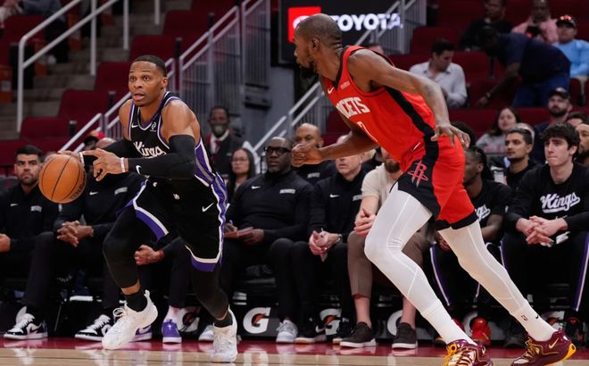 国王队这边,威少出战17分钟,8中3得到8分2板5助攻,个人生涯得分超邓肯升至历史第17;雷诺出战15分钟,9中6得到14分3板1助攻。 值得一提的是,火箭半场全队出现10次失误,三分合计12中4,背靠背尽显疲态。