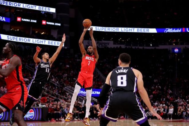 次节回来,尤班克斯篮下勾手命中,蒙克急停后撤步跳投再中,国王反超火箭2分。申京造犯规两罚全中,谢泼德和奥科吉连中三分,火箭重新拿到领先优势。威少空切上篮再打进已得8分,小史密斯钉板大帽拉文被吹犯规,火箭果断选择挑战,成功取消犯规。杜兰特迎着防守干拔中距离得手,随后大空位接球三分再中,火箭重新领先到5分。德罗赞连续远投命中,半场战罢,国王52-51再次反超火箭1分。