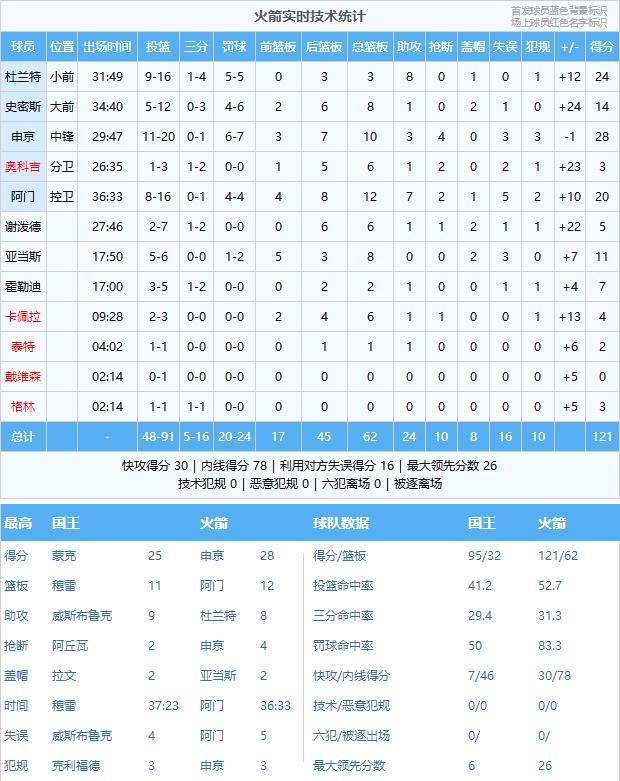 申京28分10板3助4断、杜兰特24分3板8助、阿门20分12板7助2断、史密斯14分8板1助2帽、亚当斯11分8板2帽、霍勒迪7分2板1助、谢泼德5分6板1助2帽、卡佩拉4分6板1助、奥科吉3分6板1助2断、格林3分、泰特2分1板1助 雷诺25分6板3助、蒙克25分3板5助2断、威斯布鲁克12分4板9助、德罗赞12分2板、阿丘瓦10分4板2断、穆雷5分11板1助2帽、拉文2分1板1助2帽、尤班克斯2分1板、克利福德2分2助