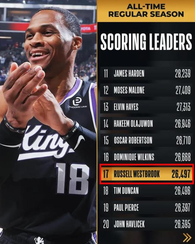威少超邓肯!火箭121-95国王,看数据:他是头号