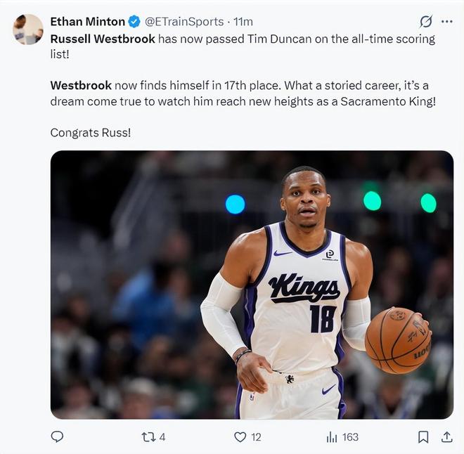 北京时间12月4日,NBA常规赛,国王惨败火箭吞下4连败。这场比赛又是拉塞尔-威斯布鲁克的里程碑夜晚,他的生涯总得分超过邓肯26496分升至NBA历史得分榜的第17位。这场比赛威少打了28分钟拿到12分9助攻4篮板1抢断4失误,拿着363万底薪的他真的尽力了,拉文5中1就2分。