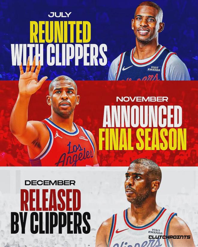 保罗凌晨3点被快船通知离队,双方分道扬镳。本赛季保罗场均2.9分1.8篮板3.3助攻0.7抢断1失误,三项命中率:32.1%,33.3%,50%。上赛季在马刺场均8.8分3.6篮板7.4助攻1.3抢断1.6失误,三项命中率:42.7%,37.7%,92.4%。