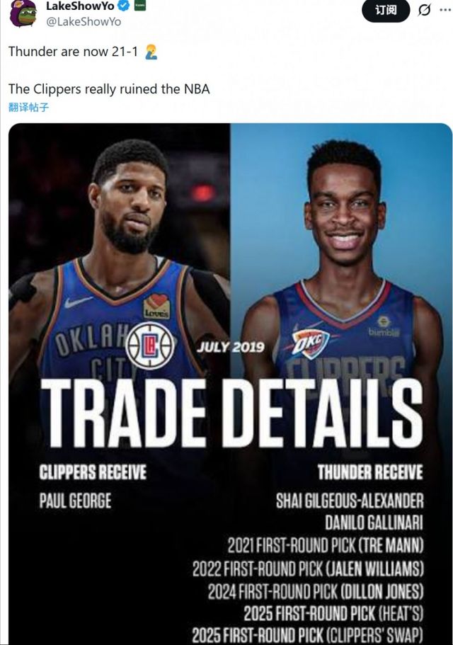 《LakeShowYo》的这句话道出了无数人的心声——2019年那笔让宇宙震惊的交易,快船为了得到伦纳德,用9换1从雷霆换来保罗·乔治,送出的筹码包括:亚历山大、2022、2023、2024、2025、2026五个首轮签和互换权,还有热火21年首轮。如今回头看,这可能是NBA历史上最糟糕的交易之一。亚历山大已成长为MVP,上赛季他实现大满贯,而快船送出的那些选秀权,正在一枚接一枚地变成雷霆王朝的基石,杰威就是快船选秀权选中。