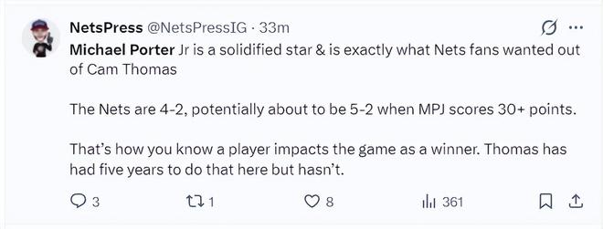 篮网媒体:小波特是一名实力出众的选手,他正是篮网球迷期待的那种球员,当他拿到30+时篮网5胜2负,如果判断一名球员是否是赢球属性就用这项标准评判,你们看看托马斯拿30+时篮网的战绩,他已经用五年时间证明自己没有赢家属性。 |