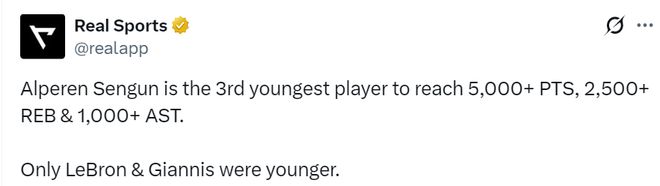 此外,23岁132天的申京成为历史上至少拿下5000分2500篮板和1000助攻第三年轻的球员,仅次于詹姆斯和字母哥。这一数据凸显了申京的全能天赋。