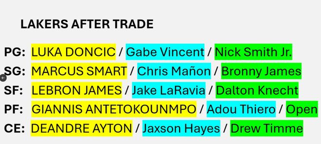 交易完成后湖人阵容,PG:东契奇、文森特、尼克-史密斯; SG:斯玛特、马农、布朗尼; SF:詹姆斯、拉拉维亚、克内克特; PF:扬尼斯、蒂耶罗、OPEN; C:艾顿、海斯、蒂米; |