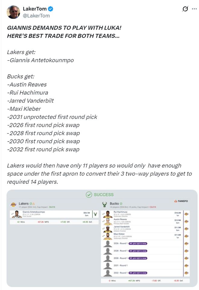 湖人媒体LakerTom为球队模拟了一套交易得到扬尼斯的方案, 湖人送出奥斯汀-里夫斯、八寸垒、范德比尔特、克勒贝尔、2031年不保护首轮、2026年首轮互换、2028年首轮互换、2030年首轮互换、2032年首轮互换,也就是9个筹码去换扬尼斯。