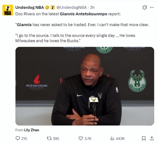 不过在对阵活塞的赛前,雄鹿主帅道格-里弗斯说道:扬尼斯从来没有申请过交易,从来没有,我再度强调一下他从未申请交易。我会直接去找那位传出假消息的人,我每天都跟扬尼斯聊天,他深爱密尔沃基,也热爱雄鹿队。