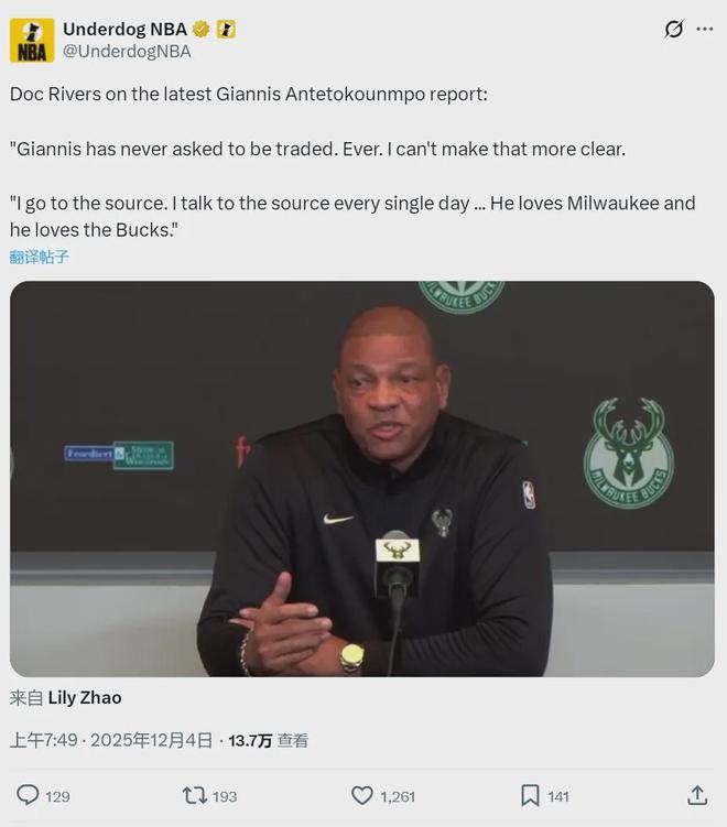 本赛季当字母哥不打时,雄鹿只有1胜5负。12月2日,雄鹿126-129不敌东部垫底的奇才。字母哥一怒之下,删除了大量跟雄鹿有关的帖文。雄鹿主帅里弗斯今天紧急回应:“字母哥之前没有提出过交易申请,现在的流言是因为我们战绩不好。”