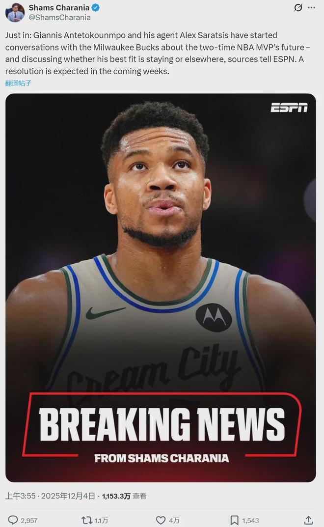 北京时间12月4日,雄鹿主场vs活塞。比赛刚开始3分钟,字母哥无对抗倒地,随后起身自己走回更衣室。雄鹿官方很快宣布,字母哥右小腿拉伤,本场不会回归。活塞第一节最多领先到18分,这会不会是字母哥在雄鹿的最后一场? 今天凌晨,据NBA名记Shams报道,字母哥和经纪人将跟雄鹿管理层展开正式会谈,双方共同探讨字母哥的未来去向。Shams还表示,除非雄鹿在本赛季出现重大转折,否则字母哥离队已成定局,雄鹿的一个时代结束了。