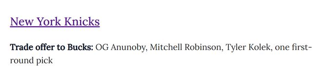 3、纽约尼克斯 交易报价:OG・阿努诺比、米切尔・罗宾逊、泰勒・科莱克、一个首轮选秀权 作为近年交易市场最具侵略性的球队,尼克斯为得到字母哥必须忍痛割爱——包括刚引进不久的OG・阿努诺比。值得一提的是,有报道称字母哥有意前往纽约打球,若能凑齐筹码,尼克斯绝不会错过这次升级机会。不过频繁的大交易让尼克斯选秀资本告急,这估计很难打动雄鹿管理层。