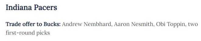 9、印第安纳步行者 交易报价:安德鲁・内姆布哈德、阿隆・内史密斯、奥比・托平、两个首轮选秀权 上赛季险些夺冠的步行者,因哈利伯顿在总决赛第七场撕裂跟腱一蹶不振,本赛季沦为联盟鱼腩。若能得到字母哥,球队有望本赛季便重回正轨,并在哈利伯顿明年回归后重新具备争冠实力——当然,这需要牺牲球队部分阵容深度。