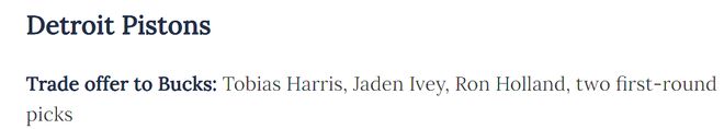 7、克利夫兰骑士 交易报价:暂无可行方案 由于骑士队的薪资超过二奢会导致不能多换一交易,只能退出字母哥的争夺。 8、底特律活塞 交易报价:托比亚斯・哈里斯、贾登・艾维、罗恩・霍兰德、两个首轮选秀权 距离队史最长连败仅过去两年,活塞如今已高居东部榜首,向总冠军发起冲击成为下一步目标。尽管字母哥不具备三分投射能力(而这正是活塞目前最大短板),但如此级别的超级巨星,一旦可交易,活塞绝无理由错过。但是这个筹码显然不够看!
