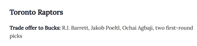 5、多伦多猛龙 交易报价:R.J.巴雷特、雅各布・波尔特尔、奥查伊・阿格巴吉、两个首轮选秀权 作为本赛季的黑马球队,猛龙阵中拥有多位实力不俗但非顶级的球员,通过交易整合阵容去争取字母哥也是不错的选择。巴雷特、波尔特尔与阿格巴吉的组合,能让雄鹿在竞争力相对薄弱的东部保持即战力,避免重建期过于漫长。
