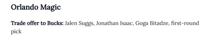13、奥兰多魔术 交易报价:贾伦・萨格斯、乔纳森・艾萨克、戈加・比塔泽、一个首轮选秀权 魔术此前已用四个首轮选秀权换来德斯蒙德・贝恩,再进行一笔大交易的可能性不大,且球队薪资结构也难以匹配字母哥的合同。不过萨格斯与艾萨克均具备顶级防守天赋,或许能成为雄鹿重建的基石。