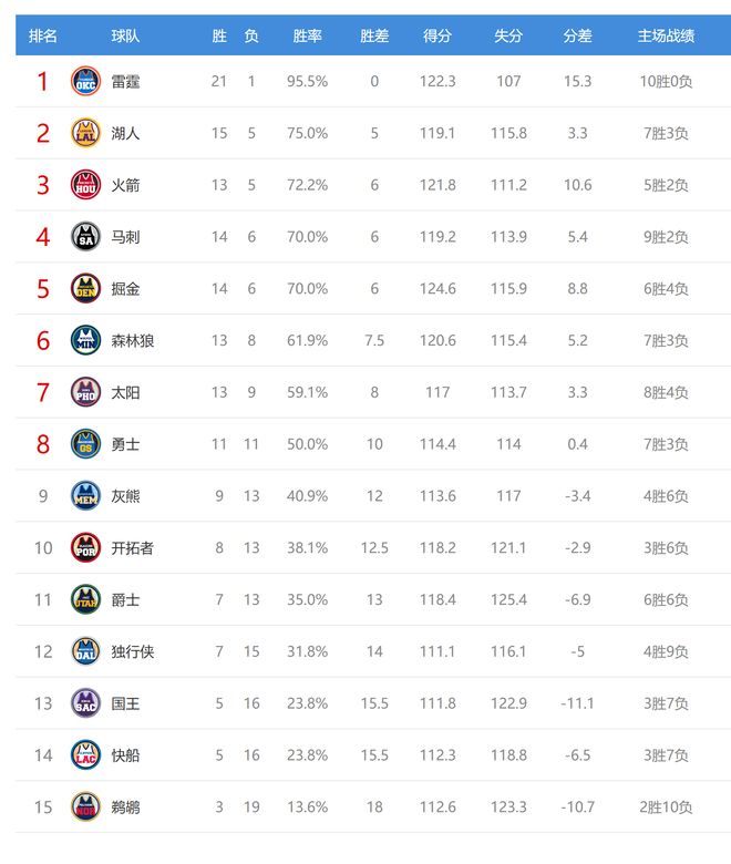 森林狼赢球后3连胜,战绩13胜8负排名西部第六,鹈鹕输球后3胜19负排名西部垫底。 今日比赛后掘金、马刺排名互换,其他西部球队排名不变。本赛季至今,雷霆、湖人、火箭、掘金的排名基本符合业界预期,马刺排名超出业界预期,独行侠、快船的排名则远低于业界预期,尤其是快船的排名令人想不到。