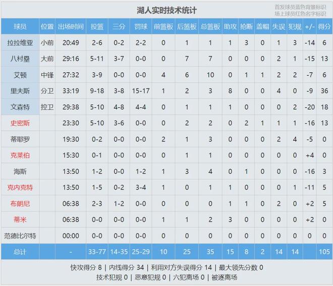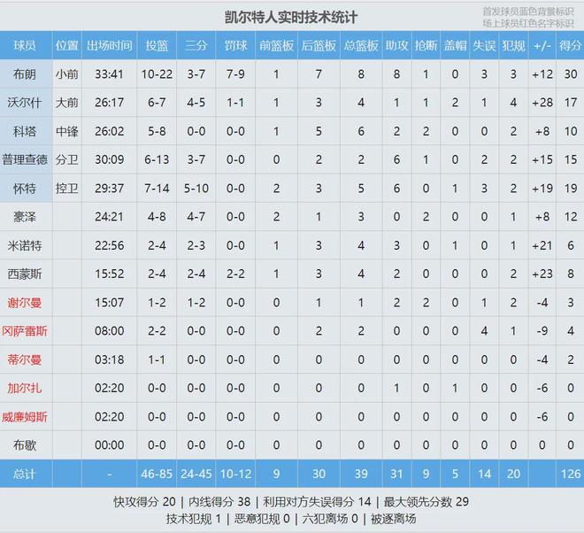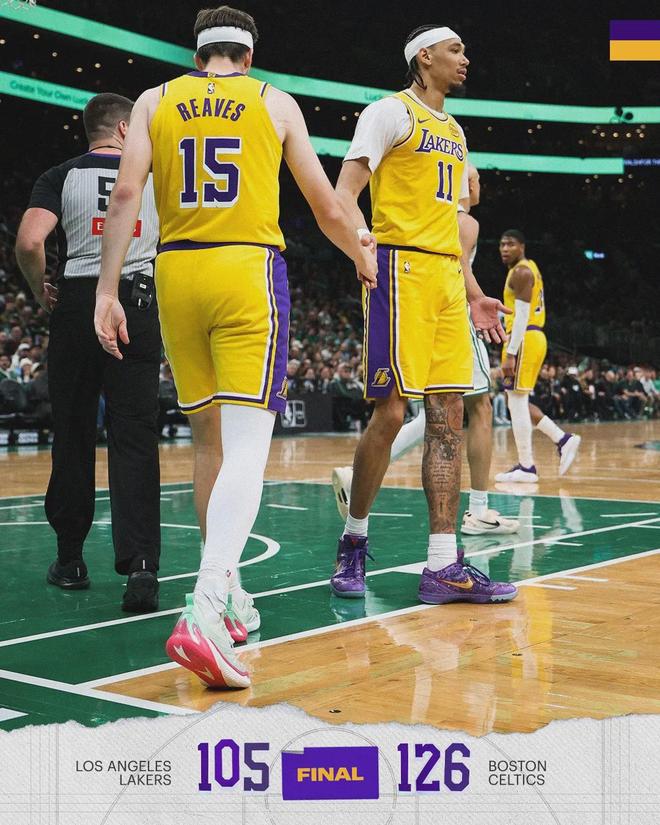 湖人赶紧把里夫斯换上场,小里两记三分帮湖人追到19分。湖人的问题是防不住,八村塁频频被点名,基本上一步被过掉。绿军前锋沃尔什,攻防两端存在感十足。最后半节,湖人落后23分换下主力。布朗尼3投2中,得到5分2失误 全场结束,凯尔特人126-105大胜湖人。凯尔特人三分球45投24中,把湖人投死了。布朗30分8板8助、怀特19分5板6助、沃尔什17分4板2帽、普理查德15分2板6助。里夫斯投篮18中9,三分8中3,罚球17中15,得到36分3板8助。