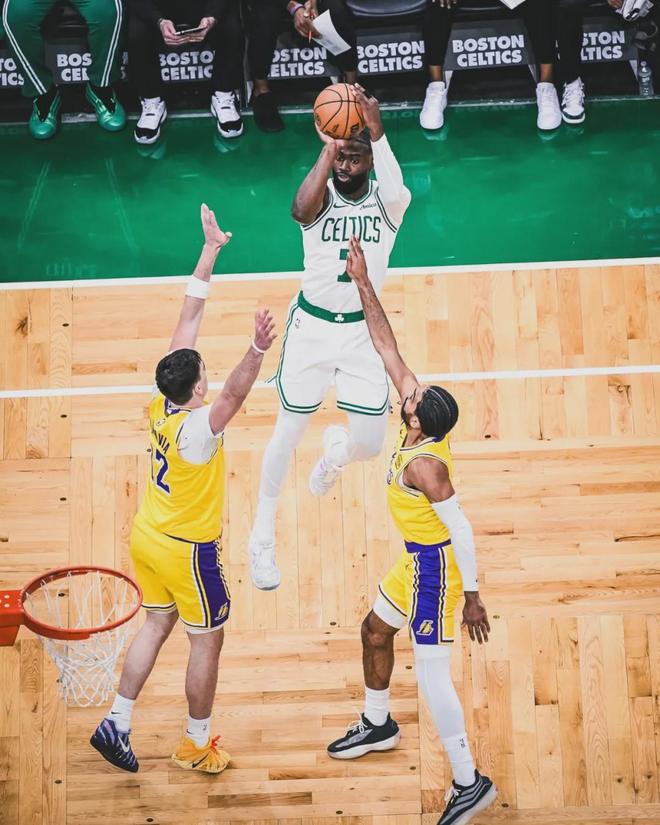 第二节开始,里夫斯手感有所回暖:单节2中2,罚球7中6,拿到10分3助攻。文森特也站出来了,单节9分进账。凯尔特人第二节30-29净胜湖人1分,半场战罢,凯尔特人69-46领先23分。湖人上半场只有6次助攻,均来自里夫斯。