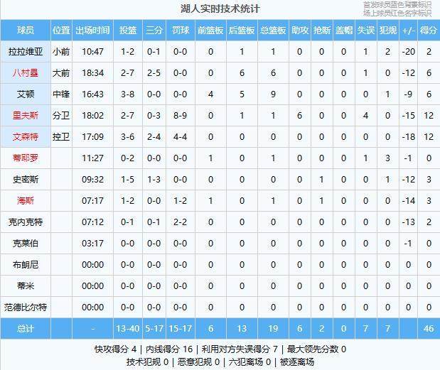 看数据:头号罪人是他! 头号罪人(里弗斯):完全没打开,半场7中2仅仅得到12分1篮板6助攻,比赛一上来各种投篮不中,同时失误也非常多,糟糕的发挥是湖人快速被拉开分差的罪魁祸首!