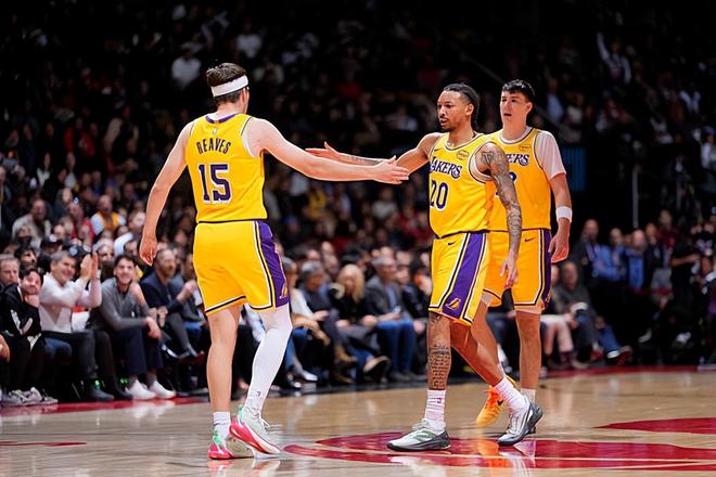本场比赛中,湖人的替补后场新星小尼克-史密斯(Nick Smith Jr.)难得得到了进入轮换阵容的机会,他的表现绝对算得上是令人眼前一亮。史密斯全场出场14分17秒,投篮7中4,三分线外3中3,罚球3中2,得到了12分2篮板2抢断的数据,没有出现失误和犯规,正负值则是达到了全场最高的+6。史密斯在进攻端展现出了全面的得分能力,他的进攻效率也是能够保持在一个不错的水平,他的持球进攻能力和投射能力都是相当不错的。除此之外,史密斯在防守端的表现也是相当不错的,同样也是起到了很好的效果。在出场时间不算太多的情况下,他也是起到了应该起到的作用,为球队的第二阵容注入了大量的活力。要不是有史密斯从板凳席上挺身而出,湖人可能还真未必能够全身而退。