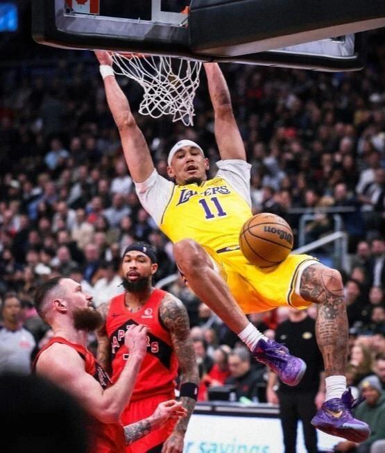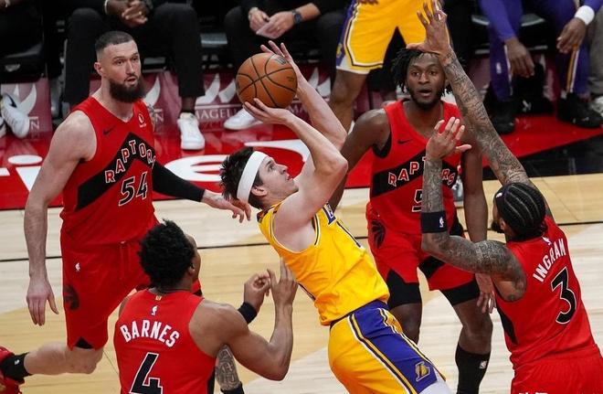 湖人VS猛龙 12月5日,洛杉矶湖人于客场挑战多伦多猛龙,此役球队核心东契奇缺阵,湖人面临巨大挑战。 但球员们并未退缩,反而斗志更盛,欲在逆境中绽放光芒。 比赛伊始,湖人队便迅速抢占先机,拉拉维亚与里夫斯连番得分。
