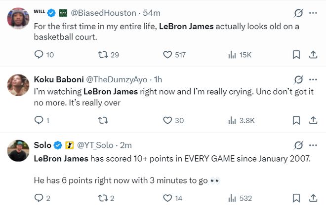 火箭媒体:这是我有生以来第一次觉得勒布朗-詹姆斯老了,他真的老了。 湖人球迷:我一直都在看湖人比赛,我实在是太心疼他,他无法跟以前那样得分了,一切都结束了。 湖人球迷,自2007年1月以来詹姆斯每一场比赛都拿到10分,可这场比赛纪录中断了。
