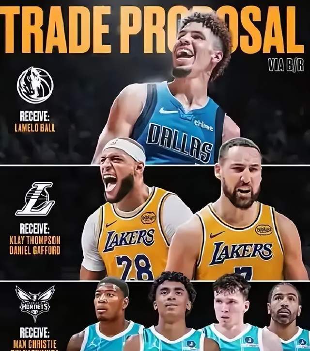 具体交易方案细节如下: 独行侠得到:拉梅洛·鲍尔; 湖人得到:克莱·汤普森 + 加福德; 黄蜂得到:年轻球员 + 角色球员 + 多个未来首轮 从表面来看,这是一出三队各取所需的剧本,独行侠拿到了过渡期核心拉梅洛·鲍尔,而志在冲击冠军的湖人得到了克莱和加福德两大即战力,而黄蜂则是继续囤积未来重建资产。 听着确实逻辑在线,但仔细一看,属实梦幻。