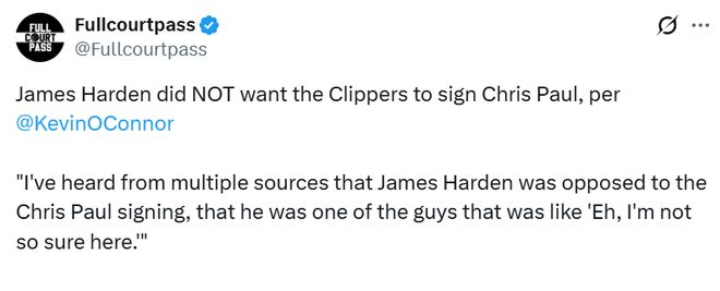 北京时间12月5日,据名记凯文-奥康纳在播客中报道,哈登在休赛期曾反对快船签下保罗。