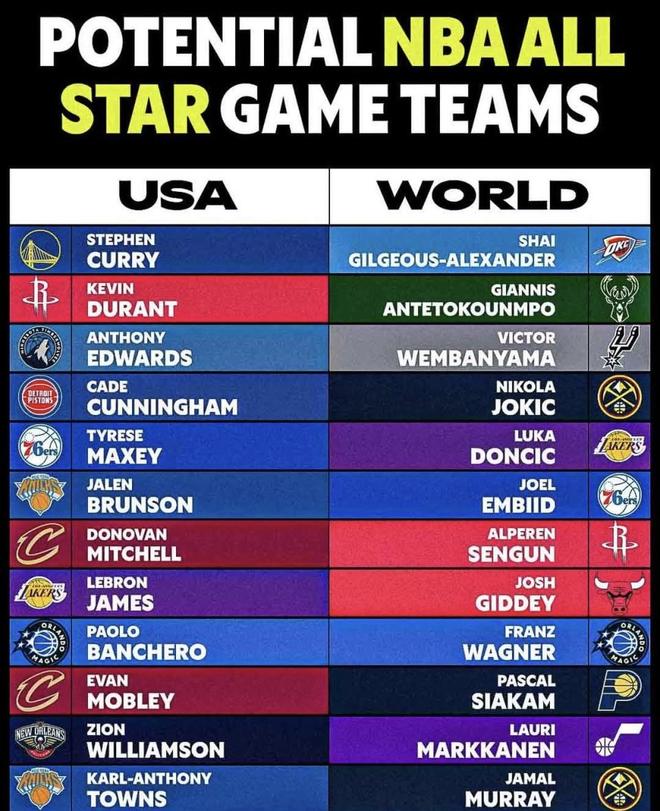 最近NBA官方宣布,从2026年开始全明星赛将启用全新的“美国对世界”赛制,两支美国队加一支世界队打迷你循环赛。 很快,篮球媒体也做出了这张“潜在全明星阵容”示意图,把库里、杜兰特、爱德华兹和亚历山大、阿德托昆博、东契奇、约基奇等人分成美国队和世界队放在一起。 两边如果真按现在的状态认真打一场,谁更有机会赢、差距在哪,自然就成了大家最想讨论的问题。